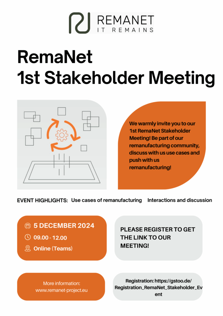 we are excited to invite you to our upcoming 1st Remanet Stakeholder Online-Event, where we will gather to discuss key updates, share insights, and collaborate on our ongoing initiatives.